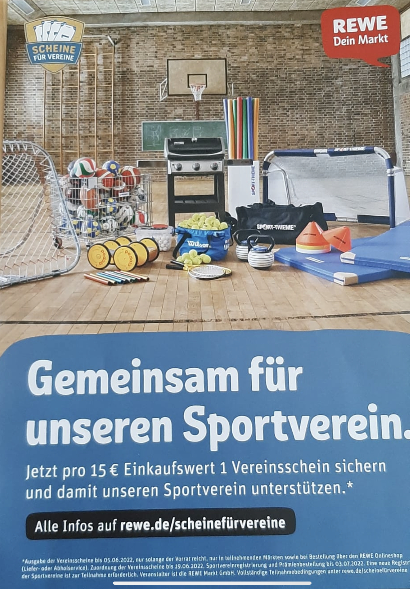 Die Aktion "Scheine für Vereine" läuft im Zeitraum vom 25.04. ? 05.06.2020. Jeder REWE Kunde erhält beim Einkauf im Markt und bei einer Bestellung auf rewe.de pro 15 ? Einkaufswert einen Vereinsschein gratis, der dann einem Amateur-Sportverein zugeordnet werden kann.